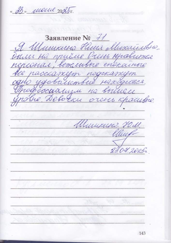 Я,Шишкина Юлия Михайловна были на приеме ,очень нравится персонал, вежливые спокойные все расскажут ,подскажут одно удовольствие находиться. Профессионализм на высшем уровне. Девочки очень красивые