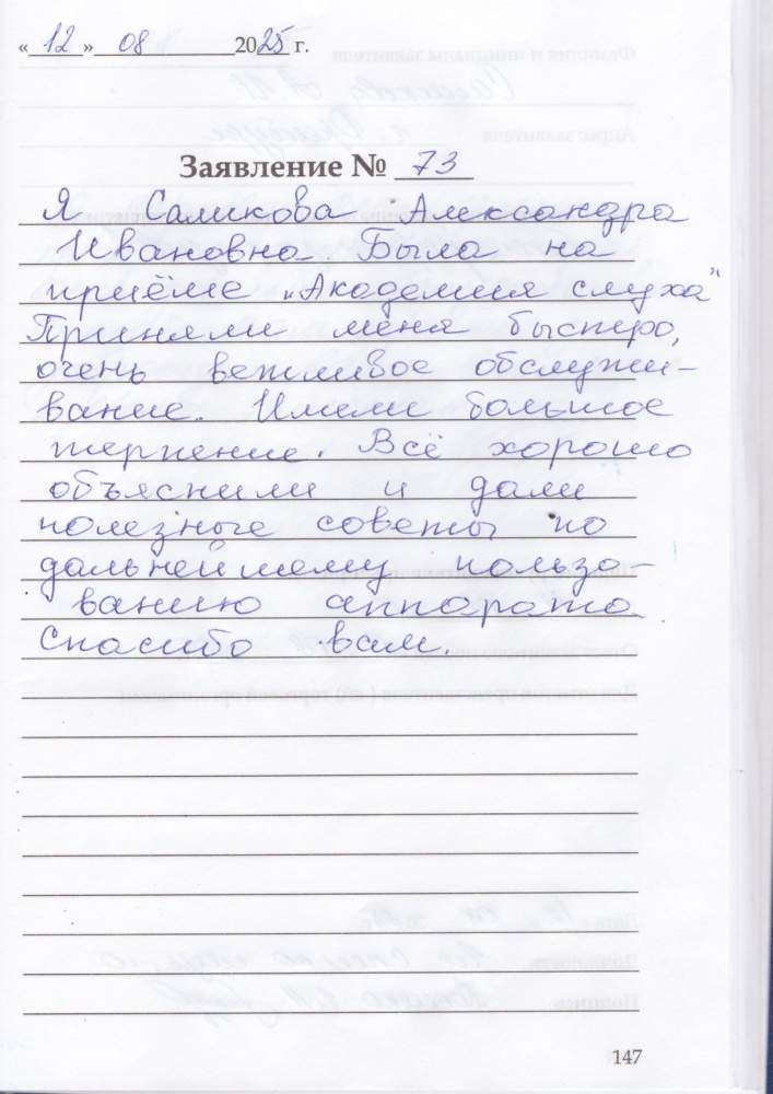 Я, Саликова Александра Ивановна была на приеме «Академия слуха». Приняли меня быстро, очень вежливое обслуживание. Имели большое терпение. Все хорошо объяснили и дали полезные советы по дальнейшему пользованию аппарата.
