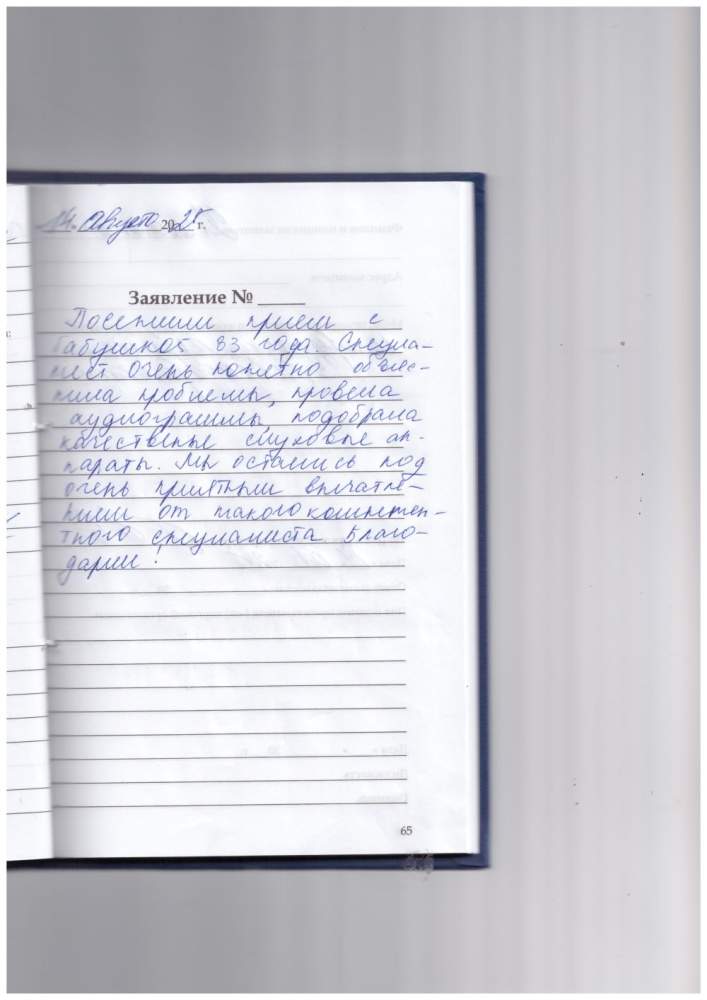 Спасибо за обслуживание.Мне почистили аппараты и теперь они звучат громко и хорошо!