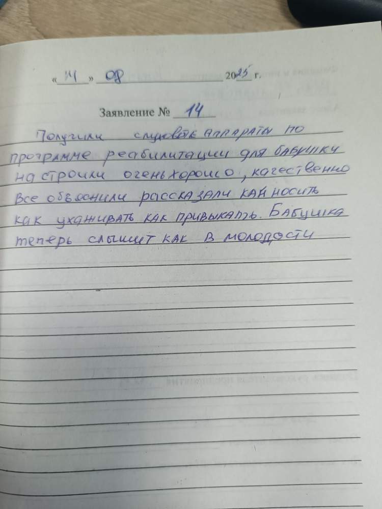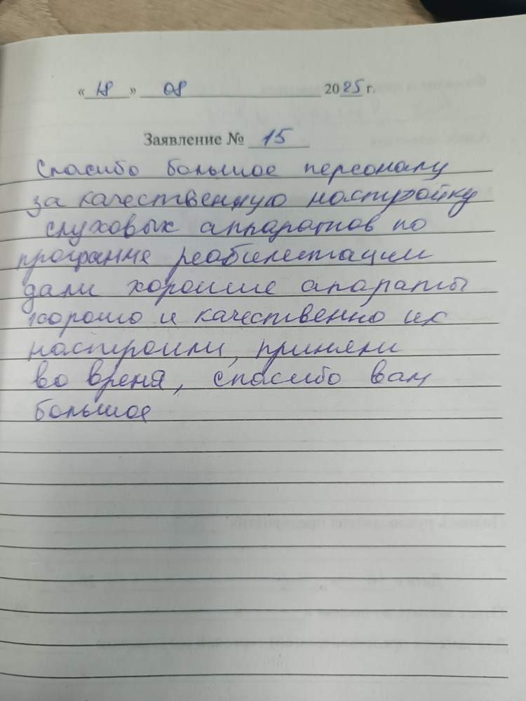 Спасибо большое персоналу за качественную настройку слуховых аппаратов по программе реабилитации, дали хорошие аппараты, хорошо и качественно их настроили, приняли во время, спасибо вам большое