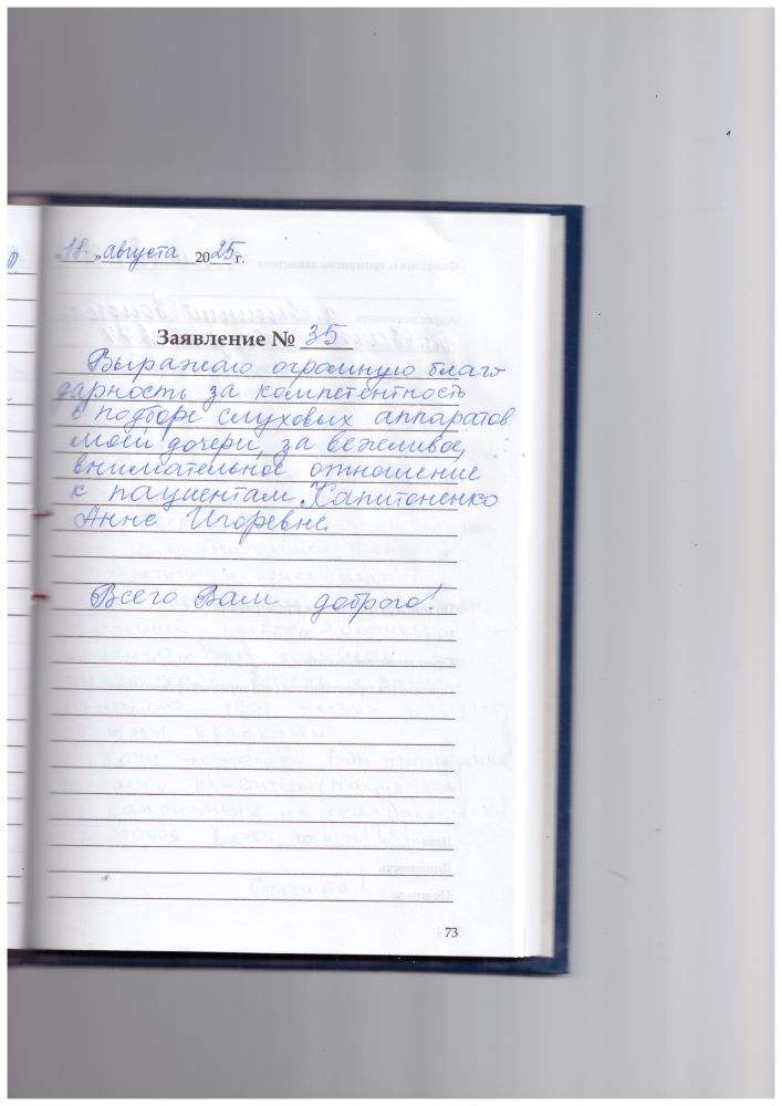 Выражаю огромную благодарность за компетентность в подборе слуховых аппаратов моей дочери, за вежливое, внимательное отношение к пациентам Капитоненко Анне Игоревне. Всего Вам доброго!
