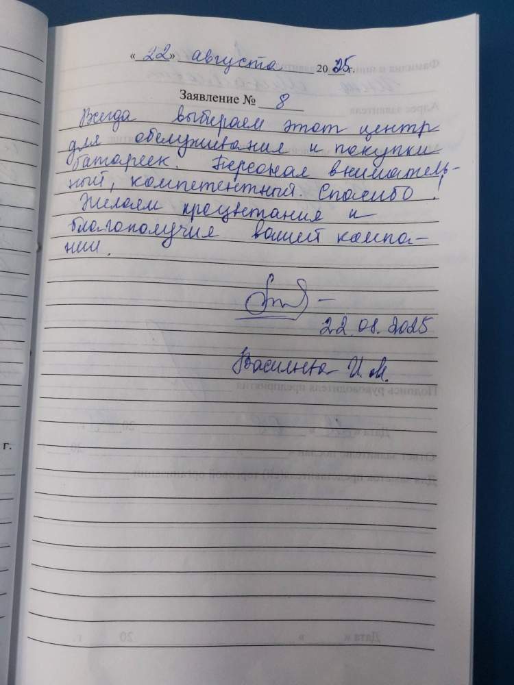 Всегда выбираем этот центр для обслуживания и покупки батареек. Персонал внимательный, компетентный. Спасибо! Желаем процветания и благополучия вашей компании.