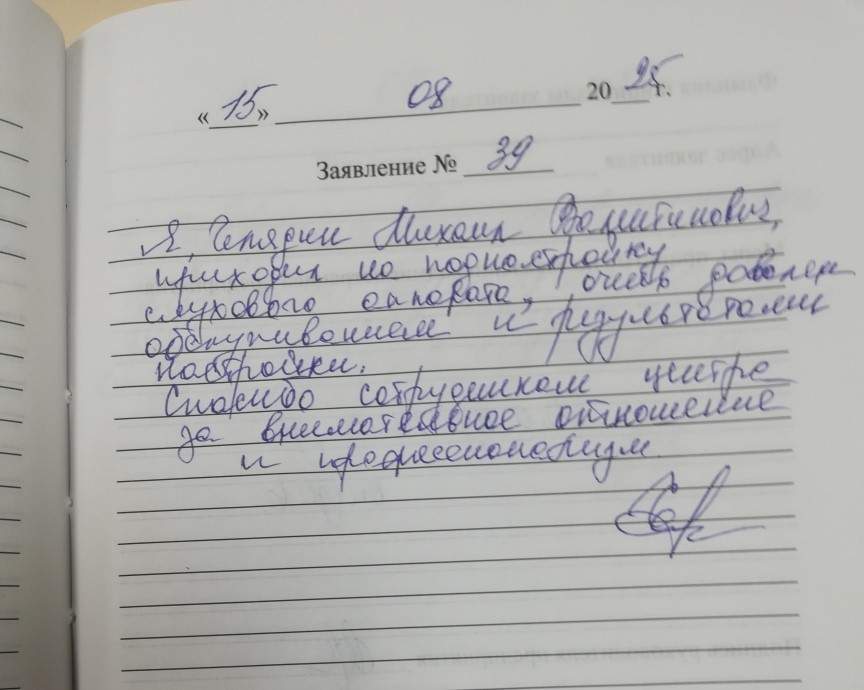 Я, Челядин Михаил Валентинович, приходил на поднастройку слухового аппарата, очень доволен обслуживанием и результатами настройки. Спасибо сотрудникам центра за внимательное отношение и профессионализм.