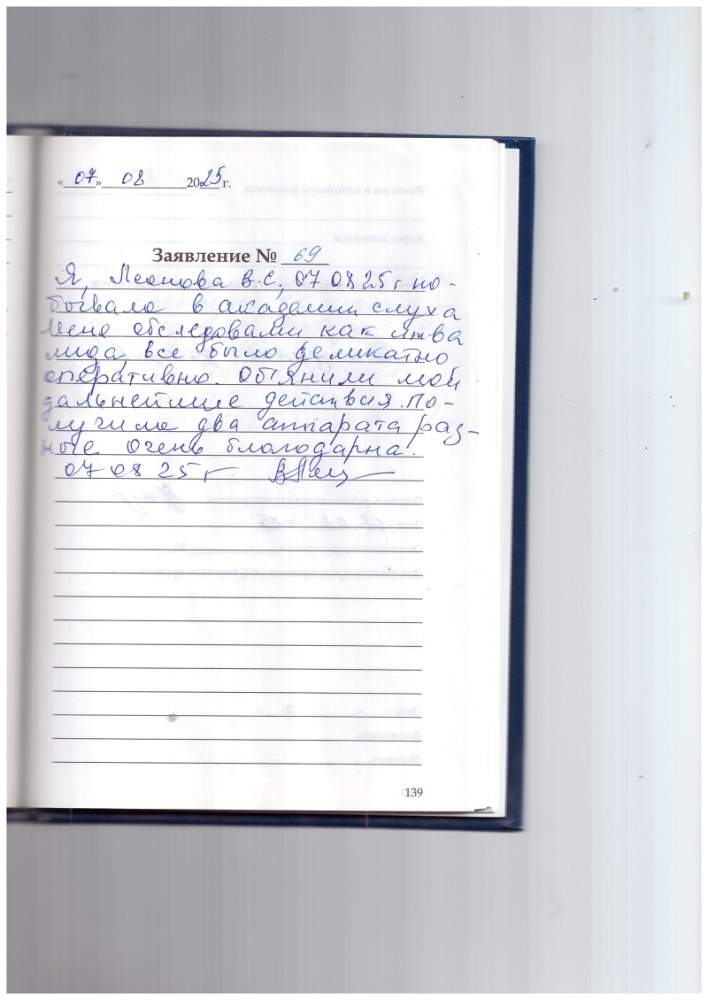 7. Я, Леонова Валентина Степановна, 07.08.2025г. побывала в Академии слуха. Меня обследовали, как инвалида, все было деликатно, оперативно. Объяснили мои дальнейшие действия. Получила два аппарата разные. Очень благодарна.