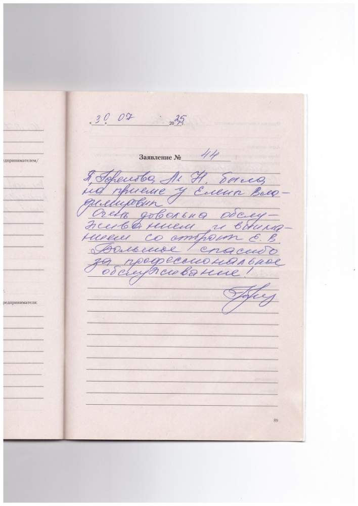 Я, Горелова Л.Н. была на приеме у Елены Владимировны. Очень довольна обслуживанием и вниманием со стороны Е.В. Большое спасибо за профессиональное обслуживание!