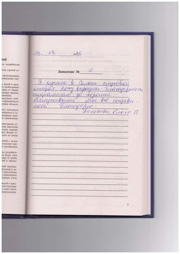 Я купила в салоне слуховой аппарат. Хочу выразить благодарность специалистам за хорошее обслуживание . Мне все понравилось, благодарю