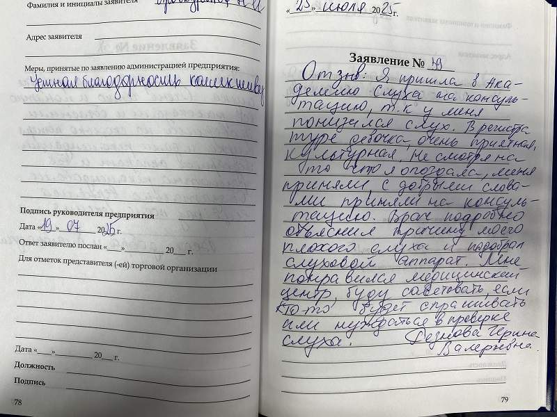Отзыв: Я пришла в Академию Слуха на консультацию, т.к. у меня понизился слух. В регистратуре девочка, очень приятная, культурная. Не смотря на то что я опоздала, меня приняли, с добрыми словами, приняли на консультацию. Врач подробно объяснил причину моего плохого слуха и подобрал слуховой аппарат. Мне понравился медицинский центр, буду советовать, если кто то будет спрашивать или нуждаться в проверке слуха.