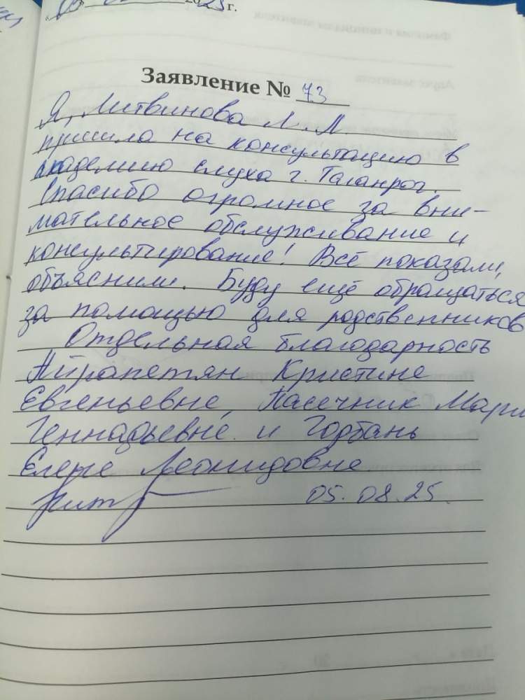 Я Литвинова Любовь Леонидовна пришла на консультацию в академию слуха г. Таганрог
