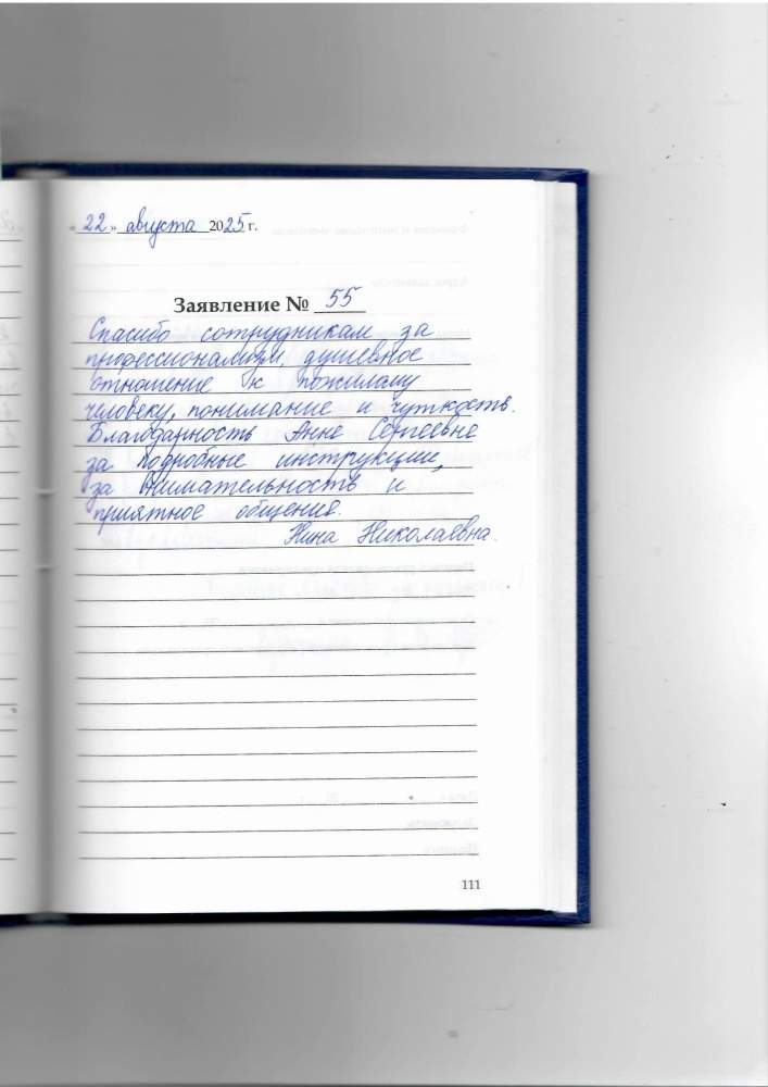 Спасибо сотрудникам за профессионализм, душевное отношение к пожилому человеку, понимание и чуткость. Благодарность Анее Сергеевне за подробные инструкции, за внимательность и приятное общение.