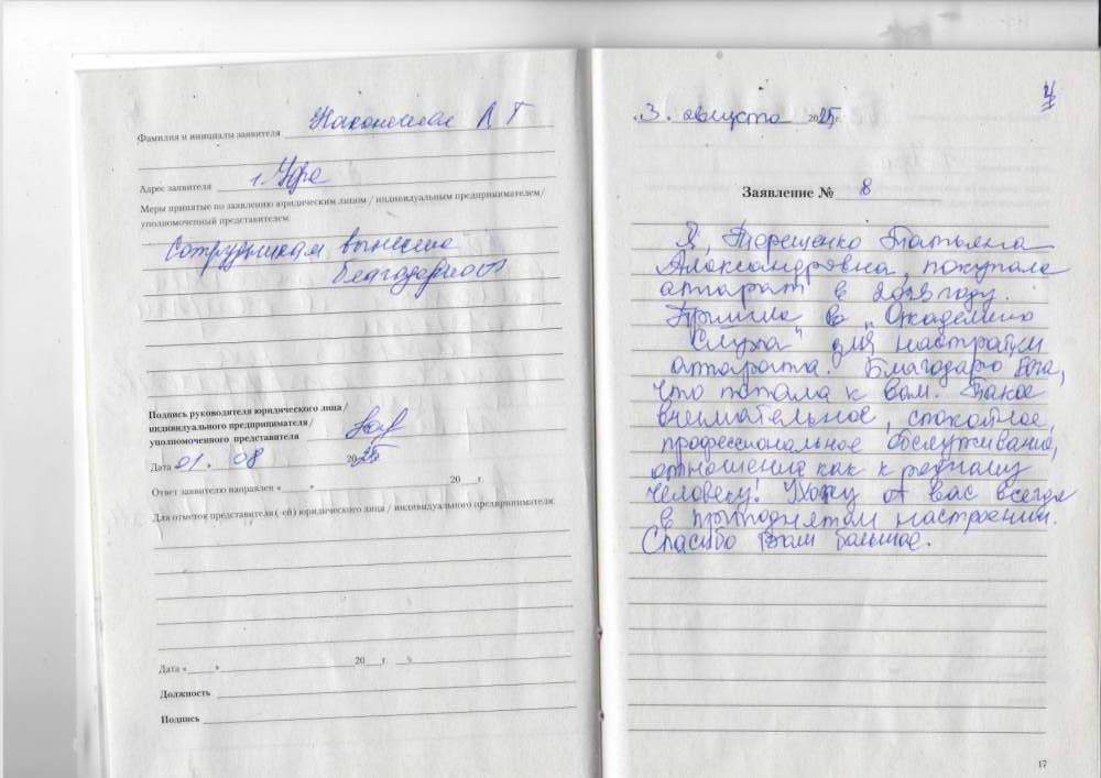 Я, Терещенко Татьяна Александровна, покупала аппараты в 2023 году. Пришла в "Академию слуха" для настройки аппарата.  Благодарю Бога, что попала к вам. Такое внимательное, спокойное, профессиональное обслуживание, отношение как к родному человеку! Ухожу от вас всегда в приподнятом настроении. Спасибо Вам большое!