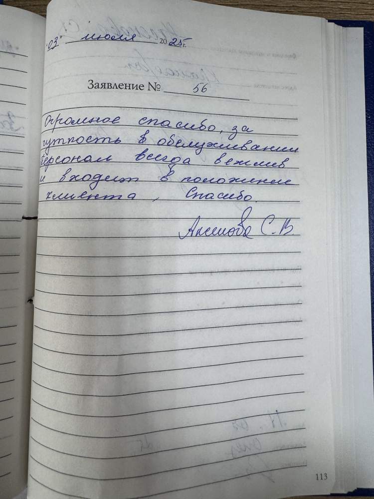 Огромное спасибо, за чуткость в обслуживании. Персонал всегда вежлив и входит в положение клиента, Спасибо.