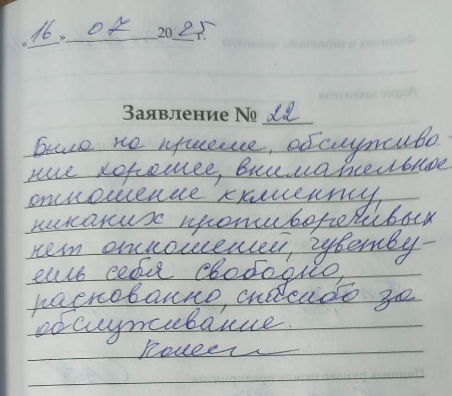 Была на приеме, обслуживание хорошее, внимательное отношение к клиенту, никаких противоречивых нет отношений, чувствуешь себя свободно, раскованно, спасибо за обслуживание.