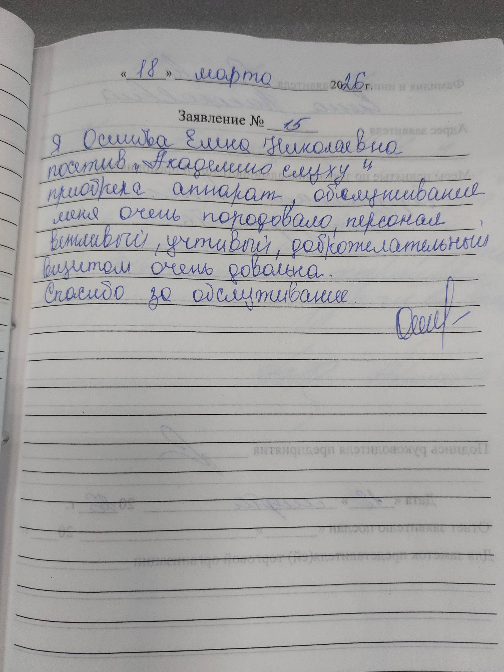 Я,Осипова Елена Николаевна посетив " Академию Слуха" приобрела аппарат,обслуживание меня очень порадовало,персонал вежливый,учтивый,доброжелательный визитом очень довольна.