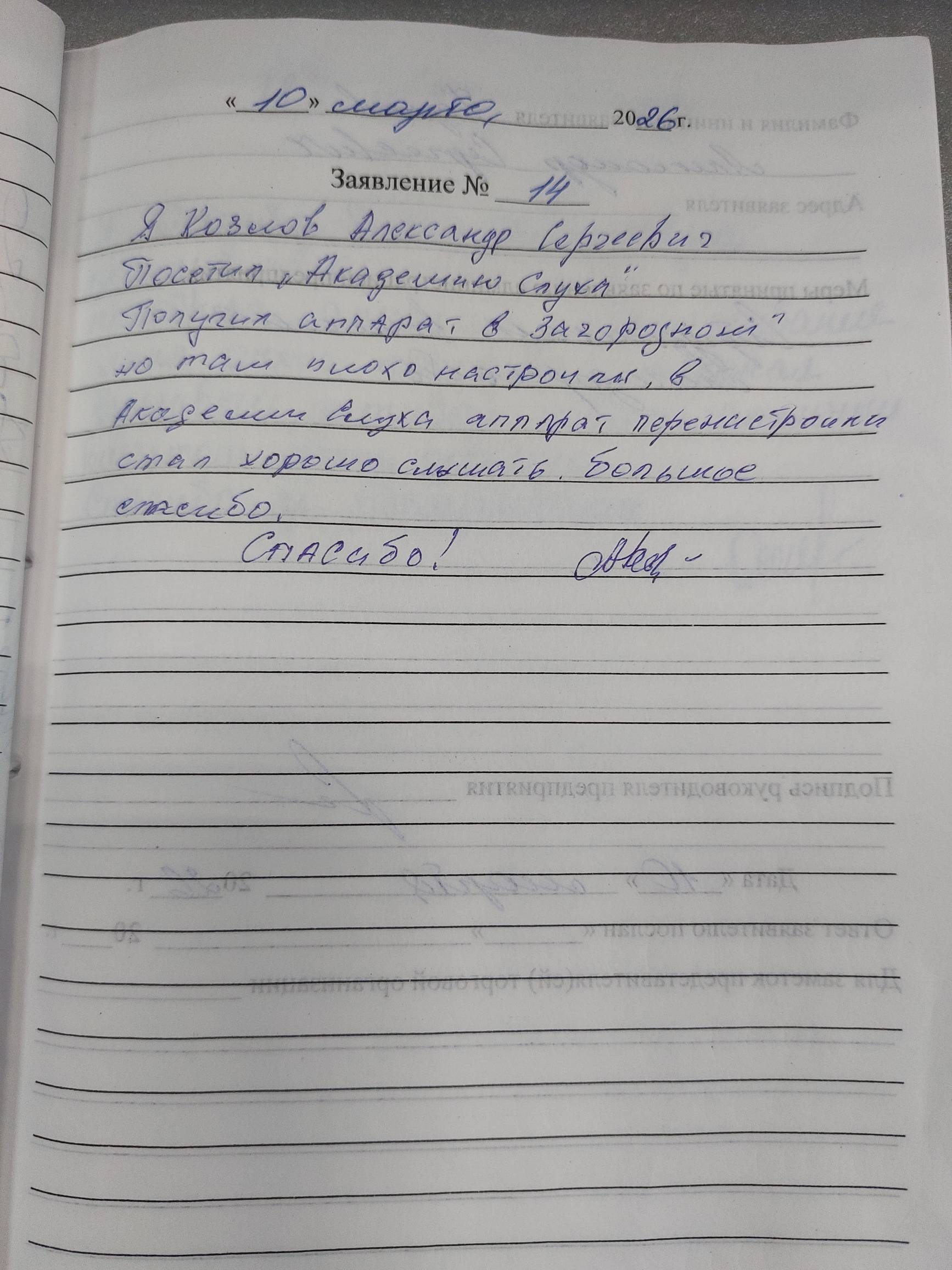 Я,Козлов Александр Сергеевич посетил "Академию Слуха".Получил аппарат в загородном,но там плохо настроили,в Академии Слуха аппарат перенастроили,стал хорошо слышать.Большее спасибо.