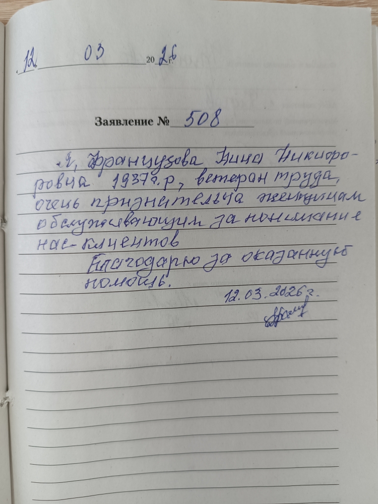 Я, Французова Нина Никифоровна 1937 г.р., ветеран труда, очень признательна женщинам обслуживающим за понимание нас – клиентов. Благодарю за оказанную помощь. 12.03.2026г.
