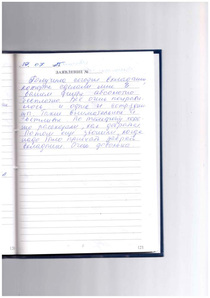 Получила сегодня вкладыши, которые сделали мне в вашем центре абсолютно бесплатно. Все очень понравилось: и офис и сотрудницы. Такие внимательные и вежливые. По телефону хорошо рассказали, как добраться. Потом еще звонили, когда надо было приехать забрать вкладыши. Очень довольна.