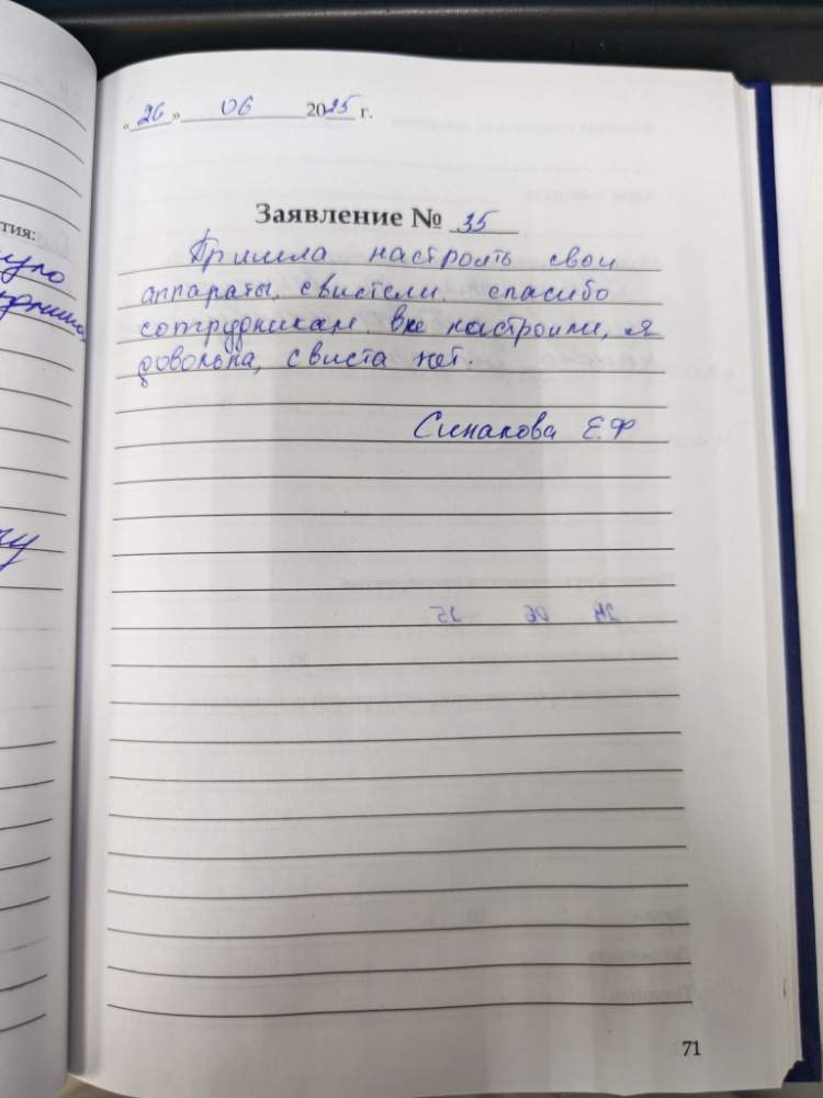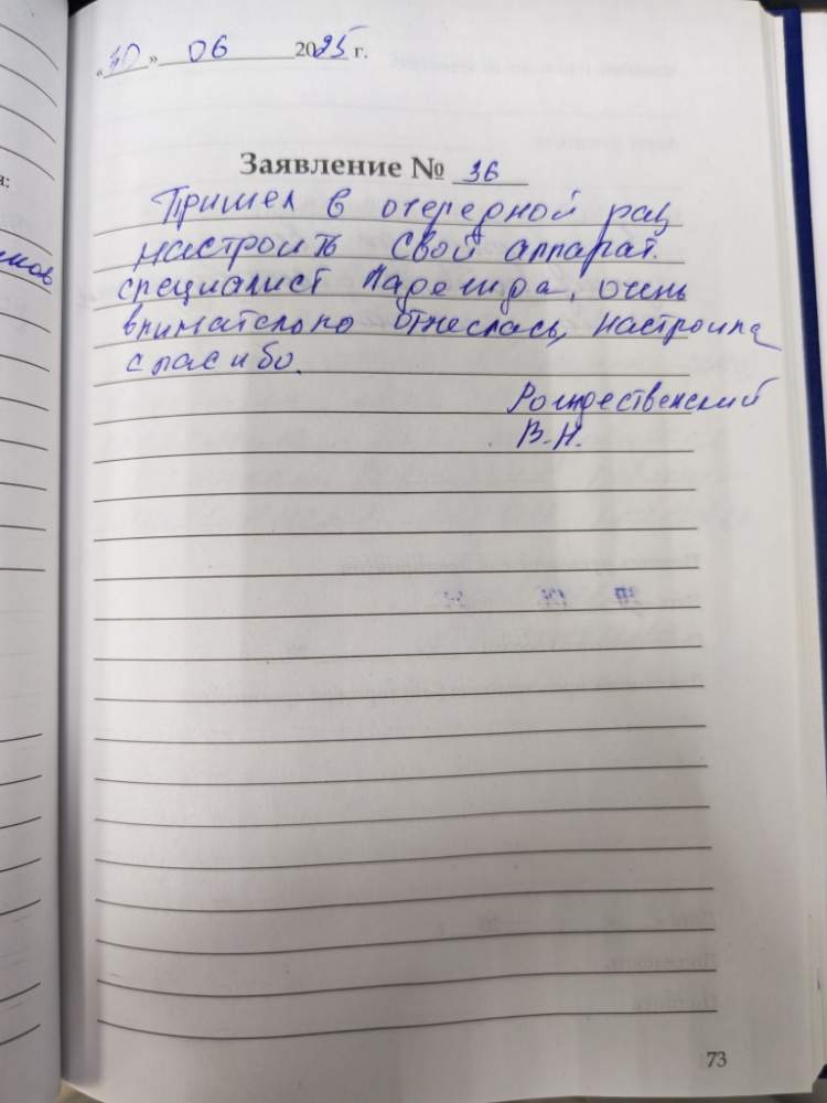 Пришел в очередной раз настроить свой аппарат. Специалист Надежда, очень внимательно отнеслась, настроила, спасибо.