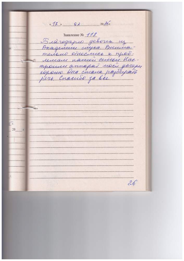 Благодарю девочек из Академии слуха. Внимательно отнеслись к проблемам нашей семьи. Настроили аппарат моей дочери хорошо. Она стала разбирать речь. Спасибо за все.