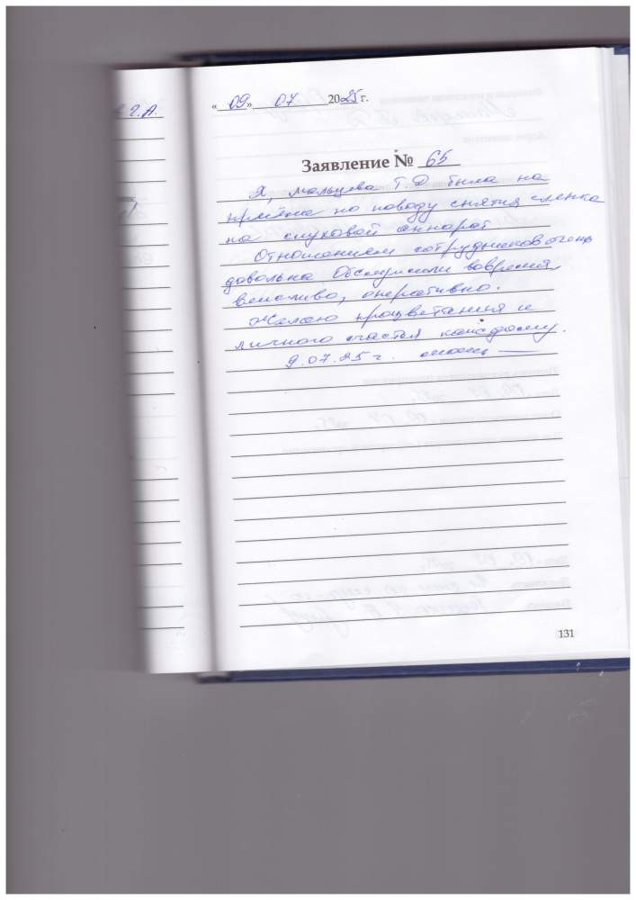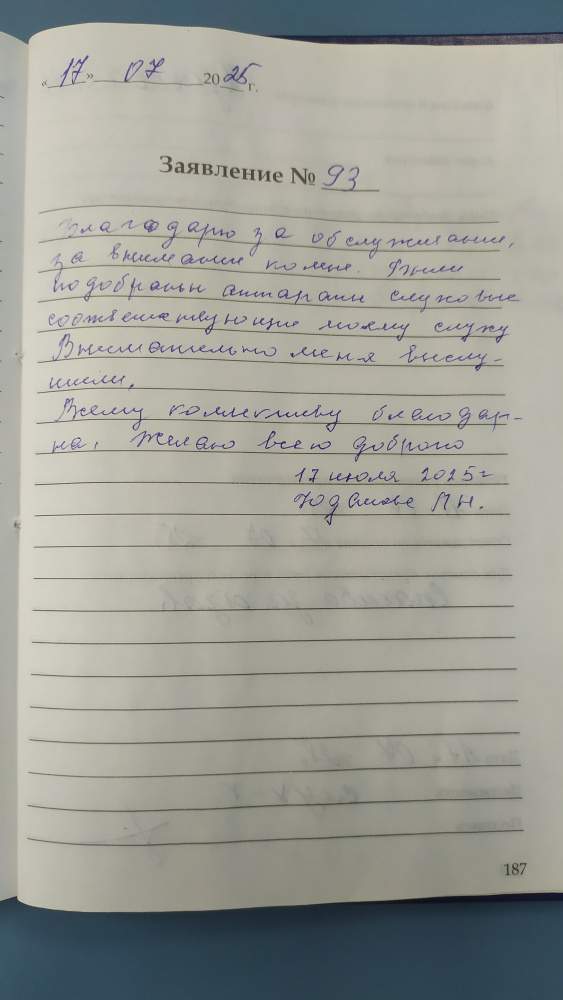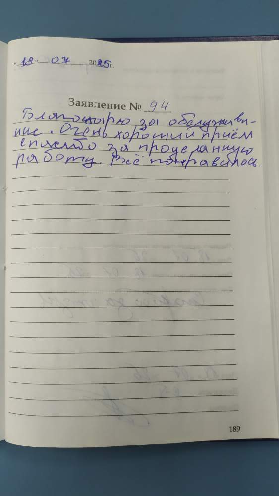 Благодарю за обслуживание, очень хороший приём. Спасибо за проделанную работу. Всё понравилось.