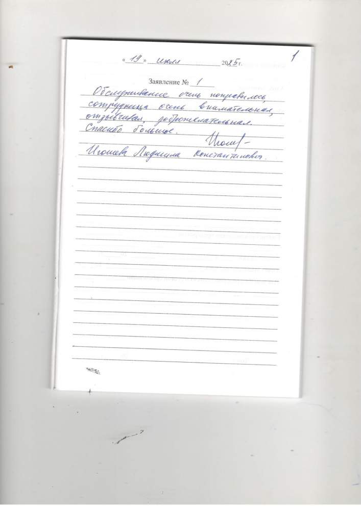 Обслуживание очень понравилось, сотрудница очень внимательная, отзывчивая, доброжелательная. Спасибо большое.