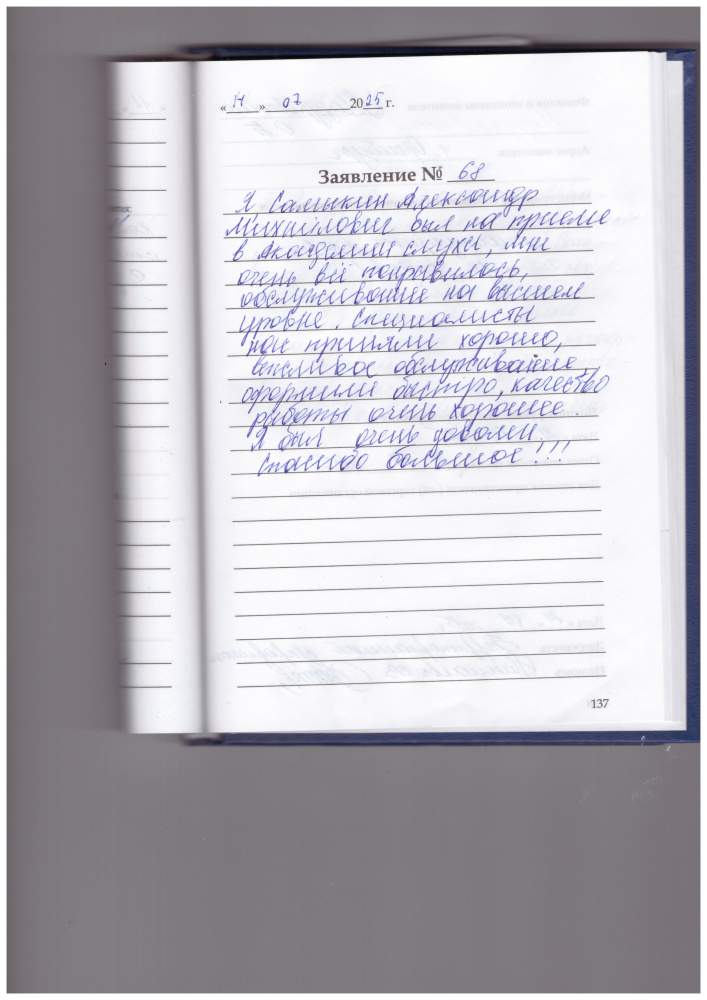6. Я, Самыкин Александр Михайлович был на приеме в Академии Слуха, мне очень все понравилось, обслуживание на высшем уровне. Специалисты нас приняли хорошо, вежливое обслуживание, оформили быстро, качество работы очень хорошее. Я был очень доволен. Спасибо большое!!!