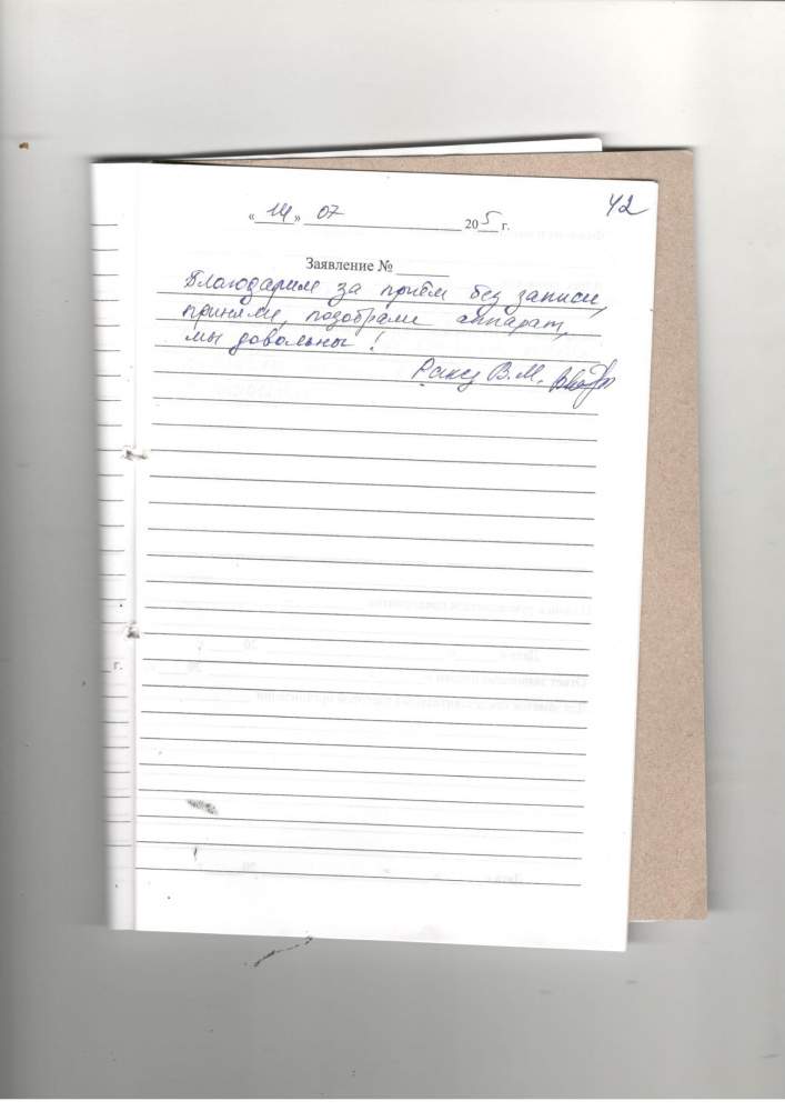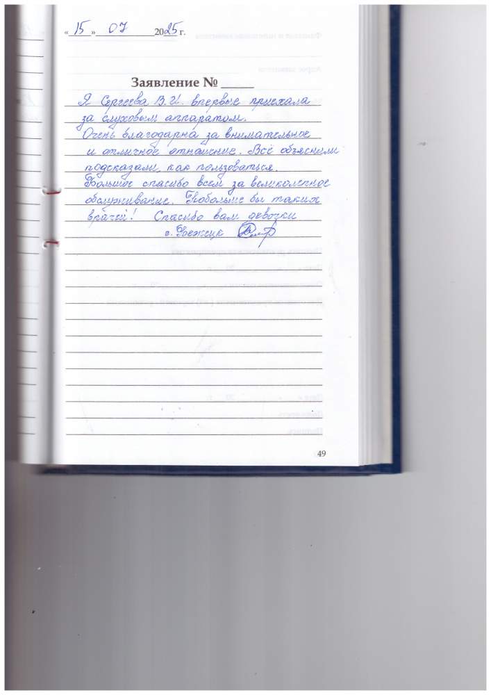 Я, Сергеева Валентина Ивановна, впервые приехала за слуховым аппаратом. Очень благодарю за внимательное и отличное отношение. Всё объяснили, подсказали, как пользоваться. Большое спасибо всем за великолепное обслуживание. Побольше бы таких врачей! Спасибо вам девочки. Г. Бежецк