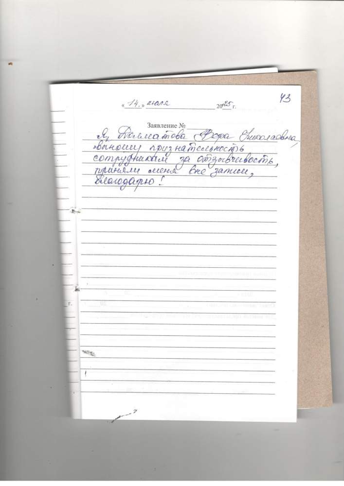 Огромная благодарность Людмиле Александровне за внимательное отношение. Желаю крепкого здоровья всем сотрудникам.