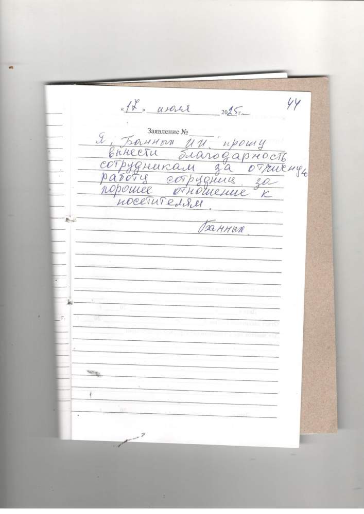 Я, Банных И.И. прошу вынести благодарность сотрудникам за отличную работу сотрудниц. За хорошее отношение к посетителям.