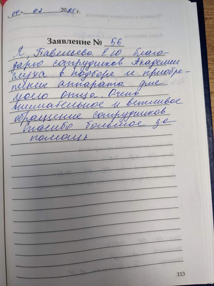 Я,Павельева Е.Ю благодарю сотрудников «Академии слуха» в подборе и приобретении аппарата для моего отца.Очень внимательное и вежливое обращение сотрудников .