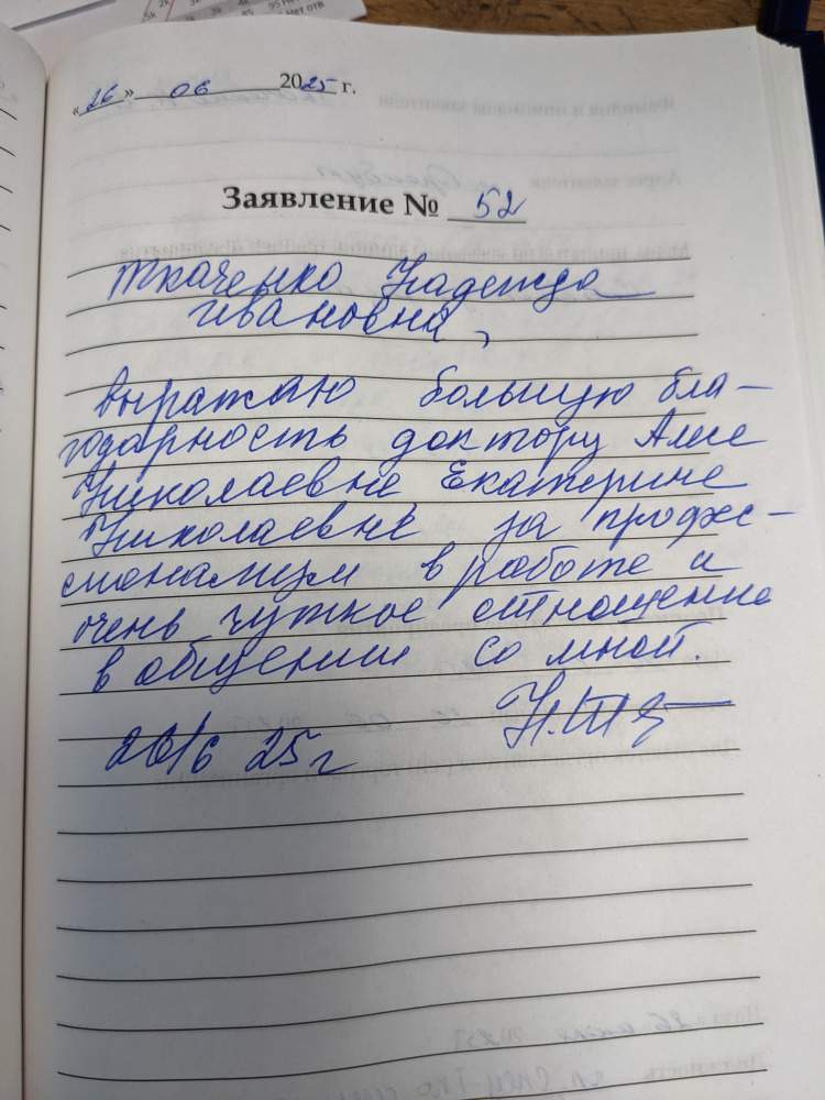 Выражаю большую благодарность доктору Алесе Николаевне, Екатерине Анатольевне за профессионализм в работе и очень чуткое отношение в общении со мной.