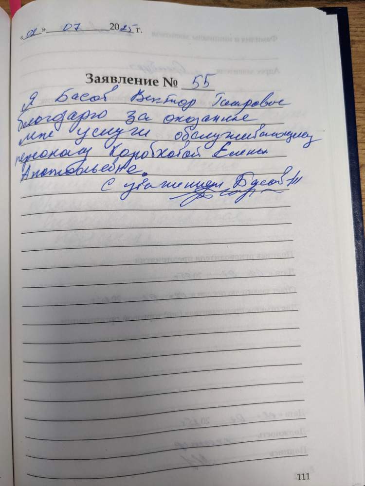 Я,Басов Виктор Тагирович благодарю заоказанные мне услуги обслуживающему персоналу Коробковой Елене Анатольевне.