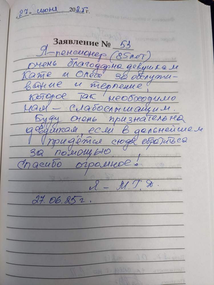 Я- пенсионер (85) очень благодарно девушкам Кате и Олесе за обслуживание и терпение, которое так необходимо нам- слабослышащим.