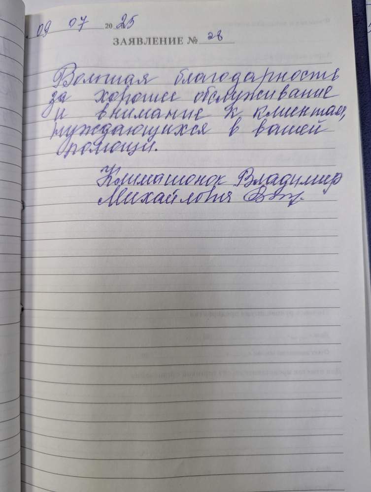 Большая благодарность за хорошее обслуживание и внимание к клиентам, нуждающихся в вашей помощи. Климашонок Владимир Михайлович