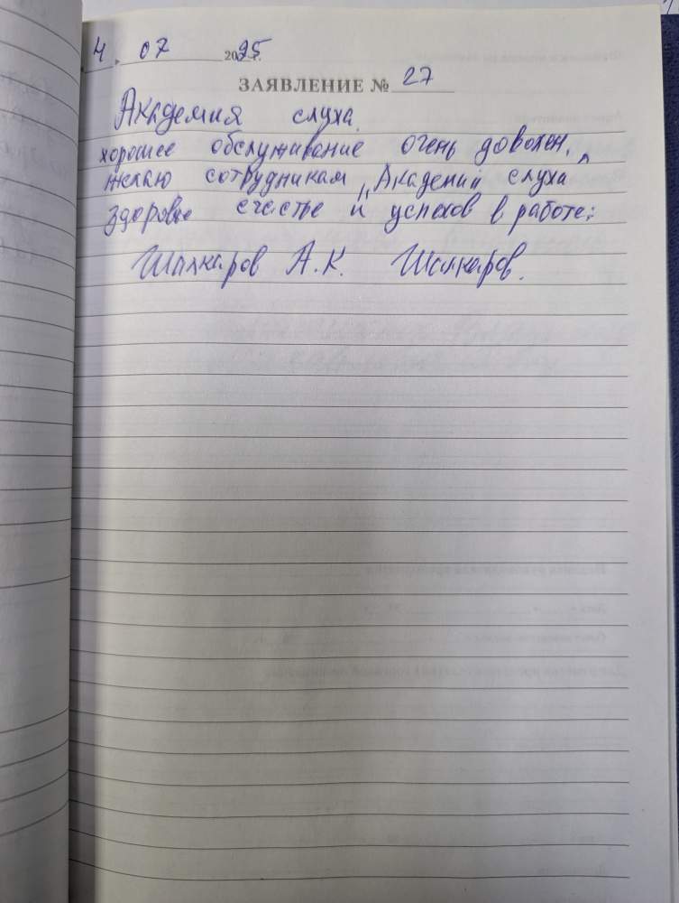 Огромная благодарность девчатам Академии слуха за их чуткость и внимательность. Покупала в центре ушной вкладыш, очень довольна обслуживанием персонала. Добры, отзывчивы. Иванова И.И.