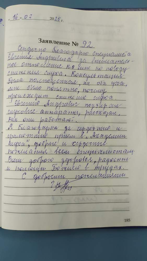 Я благодарю за сердечный и грамотный приём в Академии Слуха, добрые и сердечные пожелания всем специалистам. Всем доброго здоровья, радости и помощи Божию в трудах.