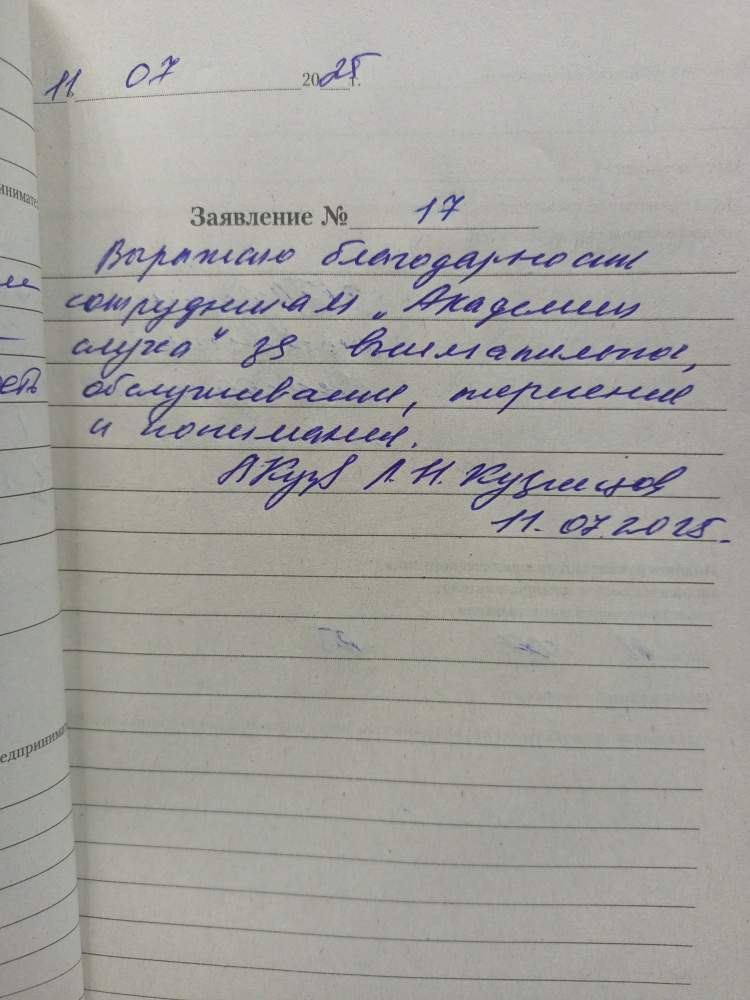 11.07.2025 Л.Н. Кузнецов Выражаю благодарность сотрудникам «Академии Слуха» за внимательное обслуживание, терпение и понимание. Л.Н. Кузнецов 11.07.2025