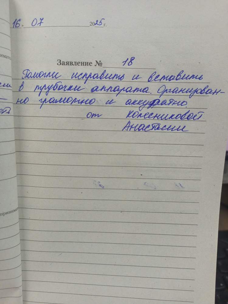 16.07.2025 Колесникова Анастасия Помогли исправить и вставить трубочки аппарата. Организованно грамотно и аккуратно от Колесниковой Анастасии