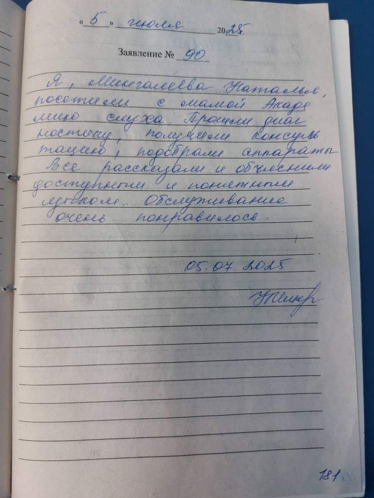 Я, Мингалеева Наталья посетили с мамой Академию слуха.Прошли диагностику, получили консультацию,подобрали аппараты. Все рассказали и объяснили.Обслуживание очень понравилось.