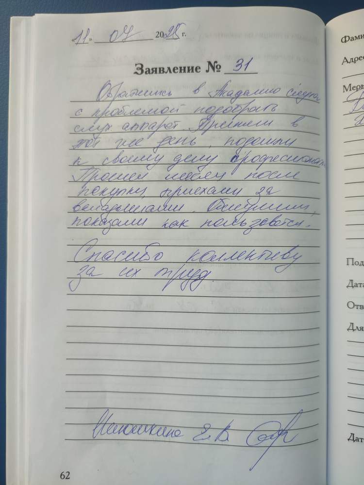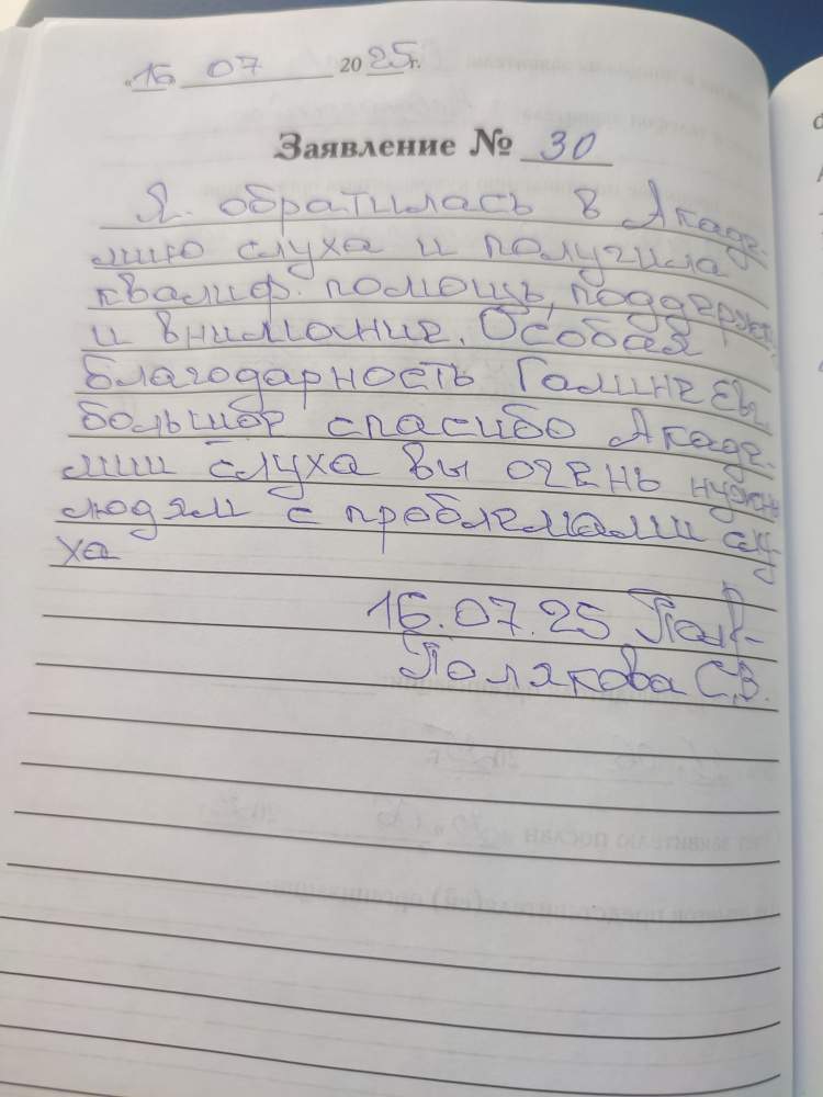 Я обратилась в Академию слуха и получила квалифицированную помощь, поддержку и внимание. Особая благодарность Галине Евгеньевне. Большое спасибо Академии слуха, вы очень нужны людям с проблемами слуха.