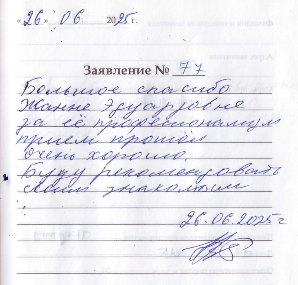 Большое спасибо Жанне Эдуардовне за ее профессионализм, прием прошел очень хорошо. Буду рекомендовать своим знакомым.