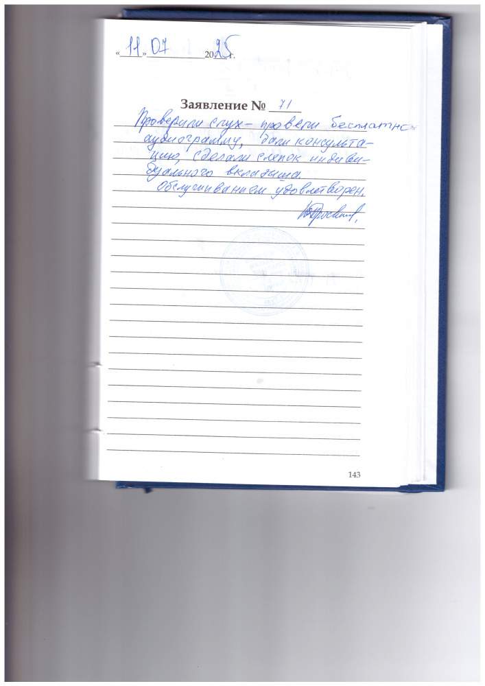 Проверили слух-провели бесплатно аудиограмму, дали консультацию, сделали слепок ИВ. Обслуживанием удовлетворен.