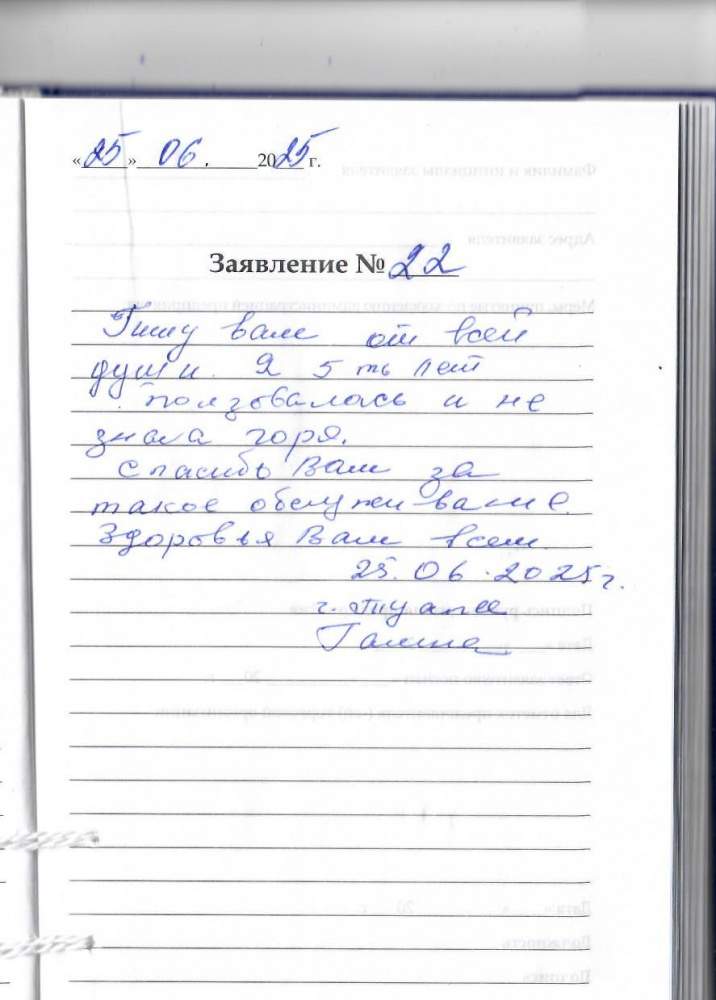 Пишу вам от всей души . Я 5 лет пользовалась и не знала горя. Спасибо за такое обслуживание. Здоровья Вам всем. 25.06.2025 г. Туапсе, Галина