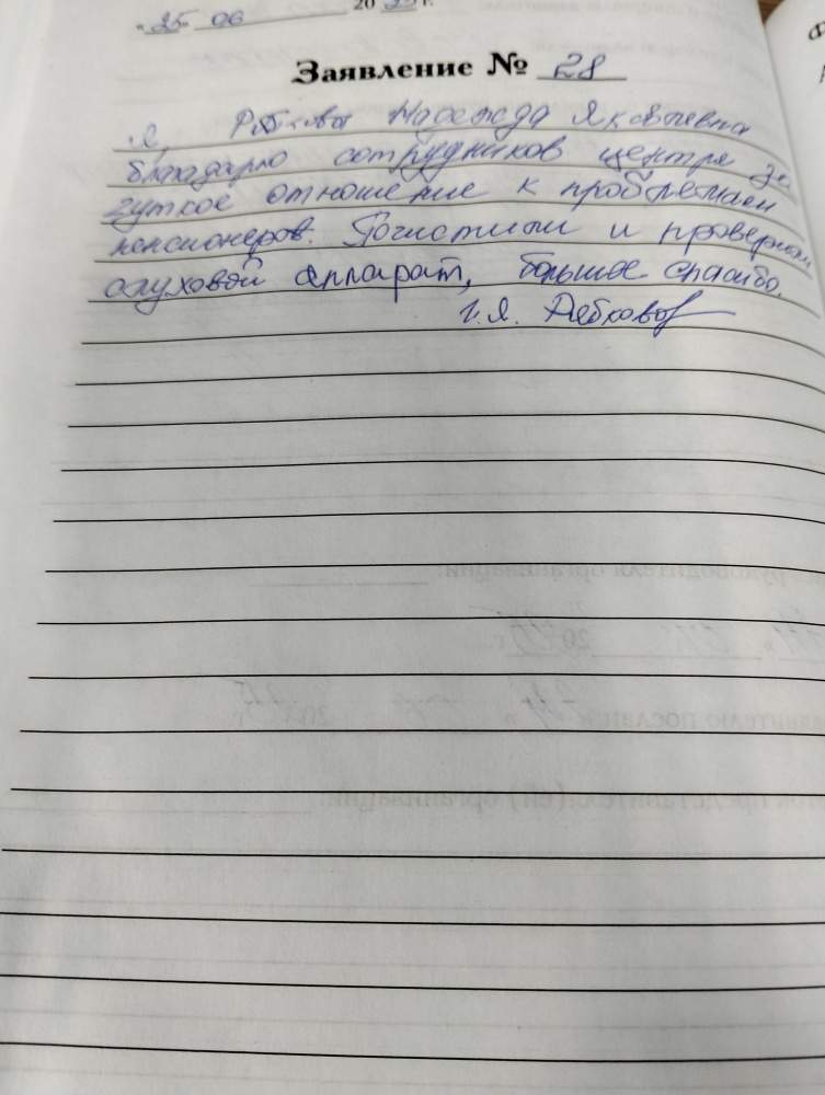 Я, Рябкова Надежда Яковлевна благодарю сотрудников центра за чуткое отношение к проблемам пенсионеров. Почистили слуховой аппарат, большое спасибо. Рябкова Н.Я.