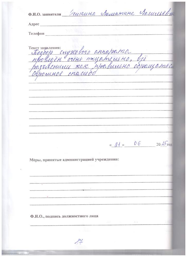 Хочу выразить благодарность за подбор аппаратов. стал слышать хорошо! Спасибо! Кононов А.Б.