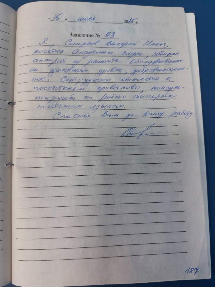 Я, Смирнов Валерий Ильич, посетил Академию слуха, забирал аппараты из ремонта. Обслуживание на должном уровне, доброжелательное.Сотрудники относятся к посетителям приветливо, консультируют по работе аппарата понятным языком. Спасибо вам за вашу работу.