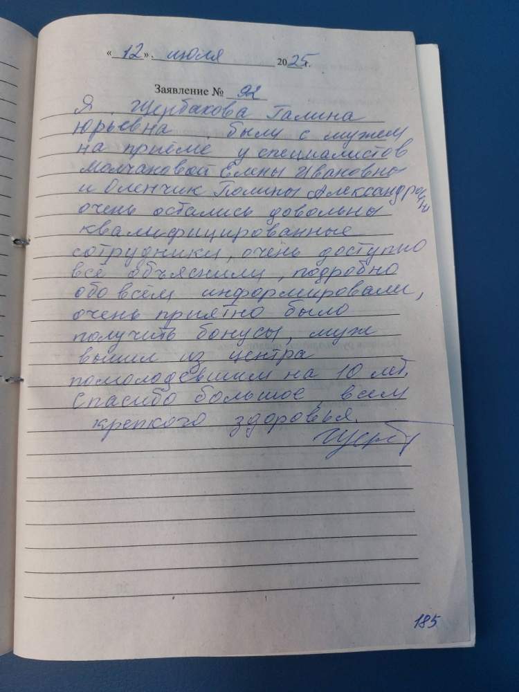 Я, Щербакова Галина Юрьевна, были с мужем на приеме у специалистов Молчановой Елены Ивановны и Оленчик Полины Александровны. очень остались довольны, квалифицированные сотрудники, очень доступно все объяснили, подробно обо всем информировали, очень приятно было получить бонусы, муж вышел из центра помолодевшим на 10 лет. Спасибо большое, всем крепкого здоровья.