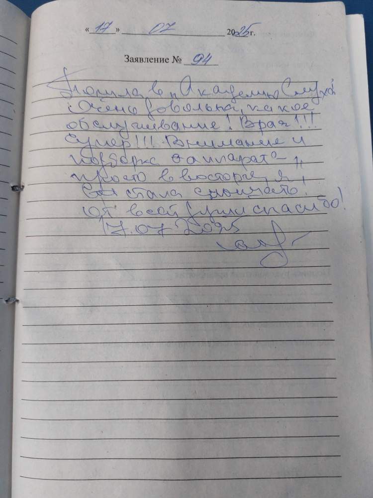Посетила Академию слуха. Очень довольна, какое обслуживание! Врач!!! Супер!!! Внимание и подборка аппарата, просто в восторге, я стала слышать! от всей души спасибо!