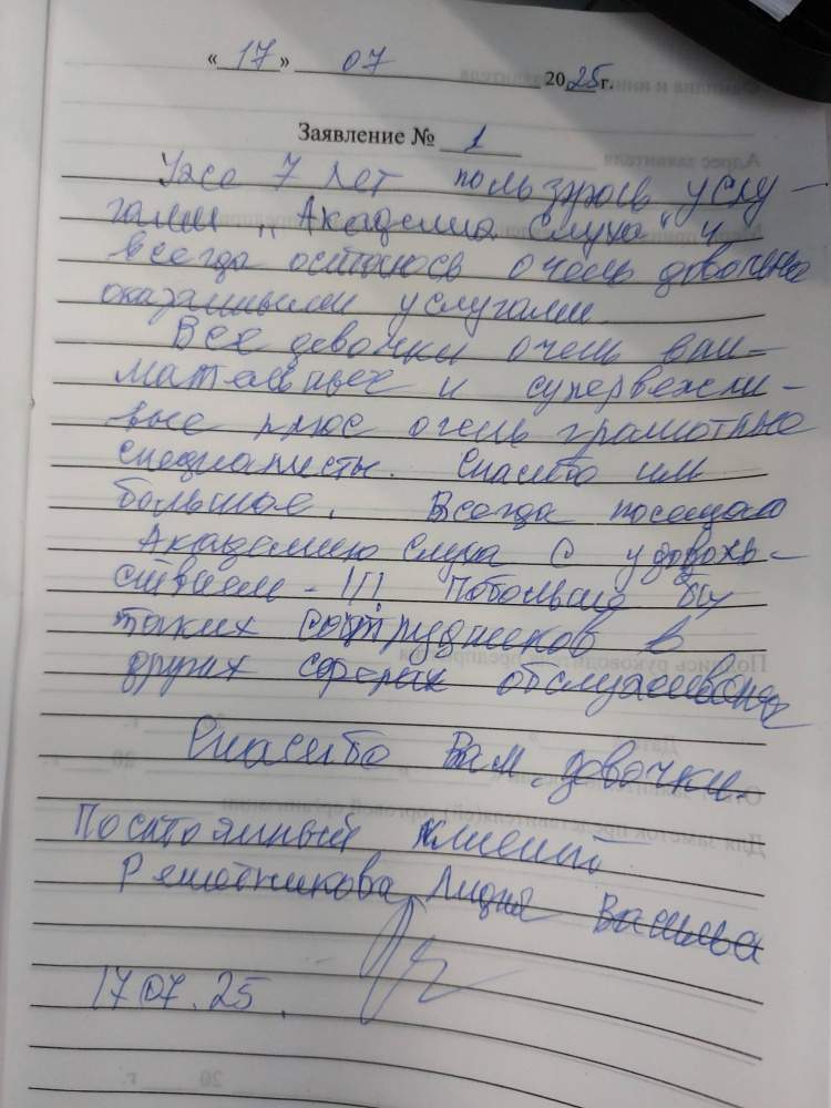Уже 7 лет пользуюсь услугами Академии слуха и всегда остаюсь очень довольна оказанными услугами. Все девочки очень внимательные и супер вежливые. Плюс очень грамотные специалисты. Спасибо им большое. Всегда посещаю Академию слуха с удовольствием!!! Побольше бы таких сотрудников в других сферах обслуживания. Спасибо Вам, девочки.Постоянный клиент Решетникова Лидия Васильевна.