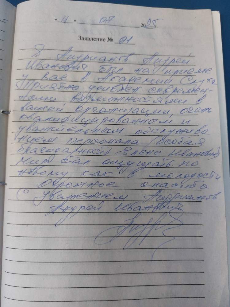 Я, Андрианов Андрей Иванович был на приеме у Вас в Академии Слуха.Приятно удивлен современными возможностями в вашей организации, очень квалифицированными и уважительным обслуживанием персонала (особая благодарность Елене Ивановне).Мир стал ощущать по новому, как в молодости.Огромное спасибо! С уважением, Андрианов Андрей Иванович.
