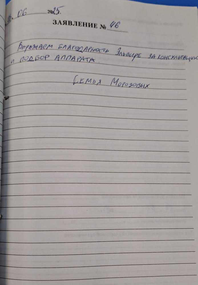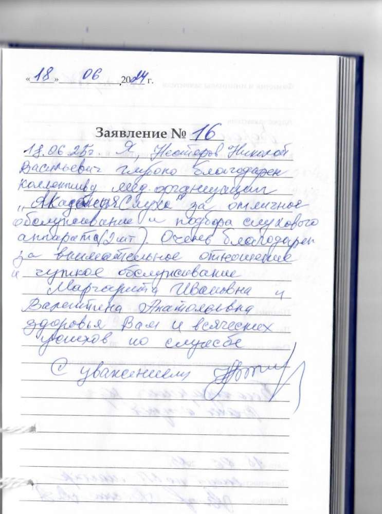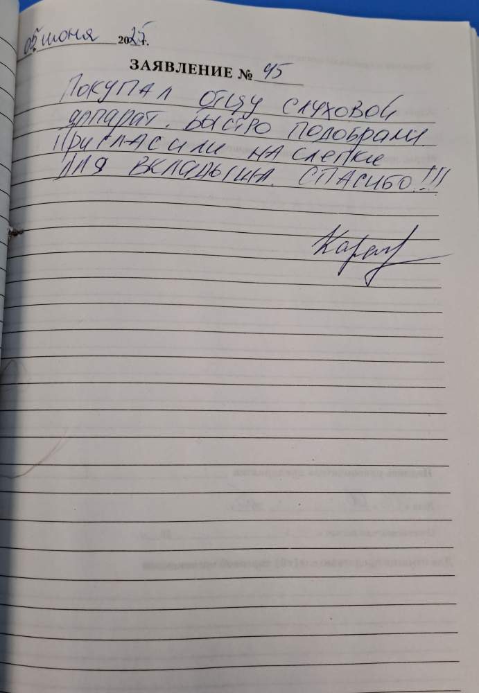 18.06.2025г. Я, Нестеров Николай Васильевич глубоко благодврен мед. организациии "Академия Слуха" за отличное обслуживание и подбора слухового аппарата (2 шт.). Очень благодарен за внимательное отношение и чуткое обслуживание. Маргарита Ивановна и Валентина Анатольевна здоровья Вам и всячиских успехов по службе. С уважением Нестеров Н.В.